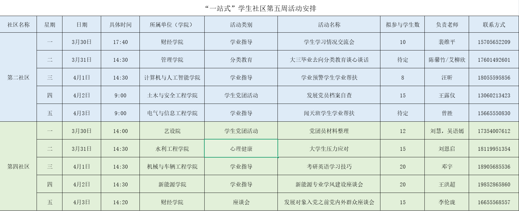 “一站式”学生社区第五周活动安排