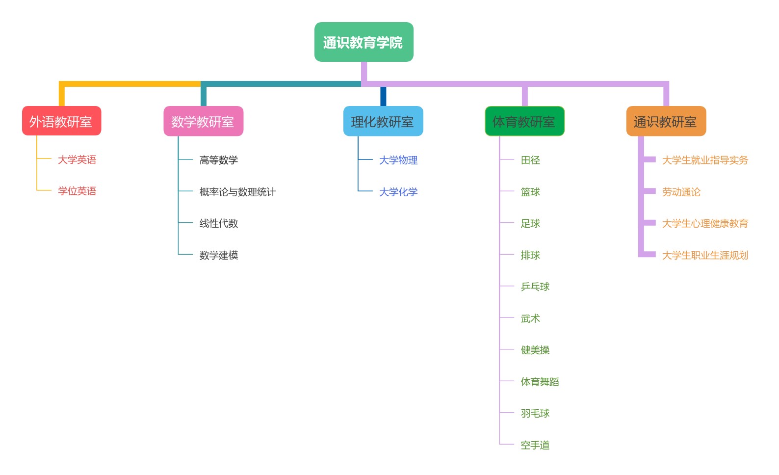 通识教育学院(原基础教学部)是校直属教学科研单位,成立于2008年9月,更名于2024年7月,下设数学、理化、外语、体育和通识五个教研室,拥有物理、化学两大类实验室。学院秉承“强基固本,启智健身,博学多思,修德砺能”的理念,承担全校大学数学、大学物理、大学化学、大学英语、大学体育及物理实验、化学实验等公共基础课程的教学任务。