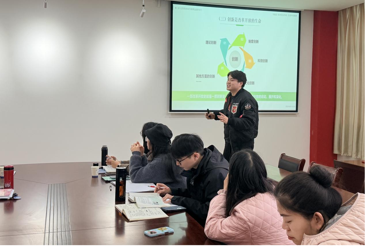 会议伊始,张闫利老师和何仁杰老师依次主讲。张老师首先对第二章“理想信念”的相关内容进行讲解。她从大家较为熟悉的影视剧《狂飙》出发,引出“理想信念”缺失带来的后果,并突出“理想信念”的内涵及重要性,由此引导同学们要坚定信仰信念信心,在实现中国梦的实践中放飞青春梦想。接着,何老师结合时政热点问题,导入了第三章“改革创新”的重要内容。他以“改革开放是当代中国最显著的特征”为重点,引出社会实际案例,运用铿锵有力的教学语言、生动且富有激情地让抽象的理论在具象化的历史场景中焕发直抵人心的力量。