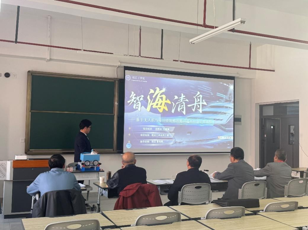 决赛现场,我校学子沉着应战、从容展现。通过精心设计的展板、逻辑清晰的现场陈述与机智沉稳的答辩,全面呈现了作品的创新性、科学性与实践价值,从众多参赛作品中脱颖而出,赢得评委们的一致认可。其中,由匡琮熙、许璐璐同学完成,韩雪老师指导的作品《智海清舟——基于无人机与多功能船舶的海洋溢油应急处理系统》荣获大赛三等奖;由邓尧、徐如意等同学完成,钱宝年老师指导的作品《高速公路应急救援机制》斩获优秀奖。
