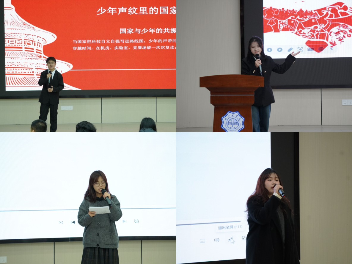 决赛分主持、演讲、朗诵三个组别依次进行,均采用命题形式展开。演讲组选手围绕指定题目,从家国情怀到个人理想,以真挚语言诠释少年担当;朗诵组选手搭配精心制作的PPT与音频,用抑扬顿挫的语调让文字焕发情感温度;主持组选手则凭借流畅的表达、自然的台风,展现专业主持素养,各组别精彩表现赢得台下阵阵掌声。在此间隙,大学生艺术团也为我们带来了精彩的歌唱表演。